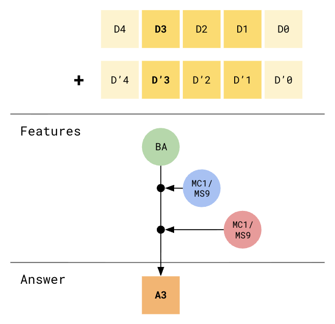 Interpreting the graph: I’ve also color-coded the feature computations by which attention head is computing those features. So, one head is responsible for computing MC1 on position_1, one head is responsible for computing MC1 and MS9 on position_2 (at most one can be true, so this can basically be treated as the same set of category features), and another head is responsible for computing BA on position_3. Then, the MLP block performs a trigram lookup for this combination of BA (green head), MC1/MS9 (blue head), MC1/MS9 (red head), and arrives at the answer for position_3.