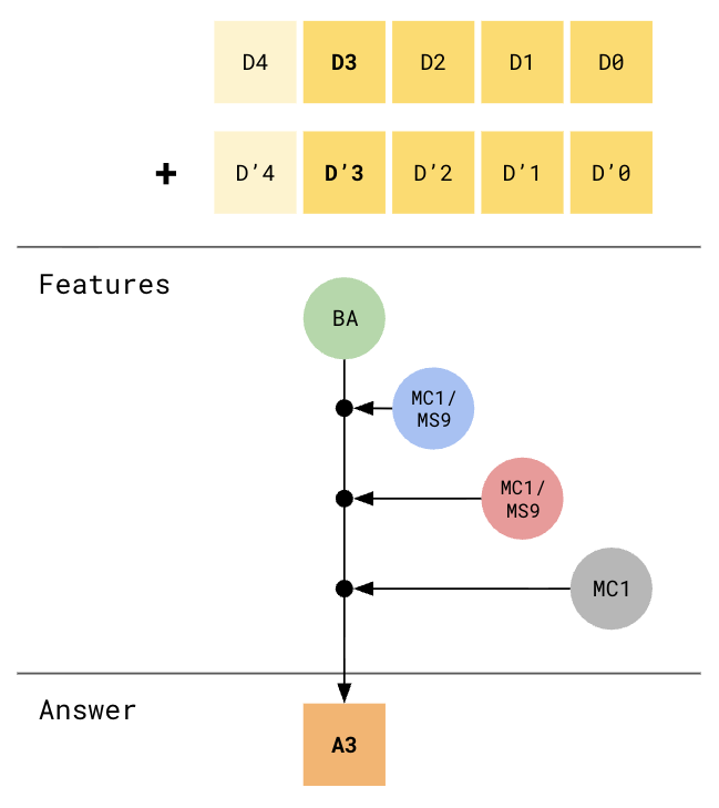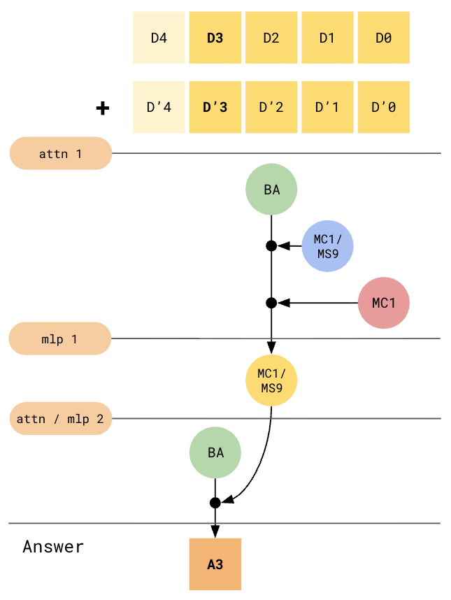 And there’s also a third computation - “Make Sum 9 (MS9),” that evaluates if $D_i + D’_i = 9$ exactly. This is an important feature because if both MS9 and MC1 are active, then the model needs to know to propagate the carry 1 to the next column. They call these receptor components Use Carry 1 (UC1) and Use Sum 9 (US9). For succinctness, we’ll assume that whenever there’s a MS9, there’ll be a corresponding US9, and same for MC1 and UC1. This way, we’ll only have to mention MS9 and MC1.