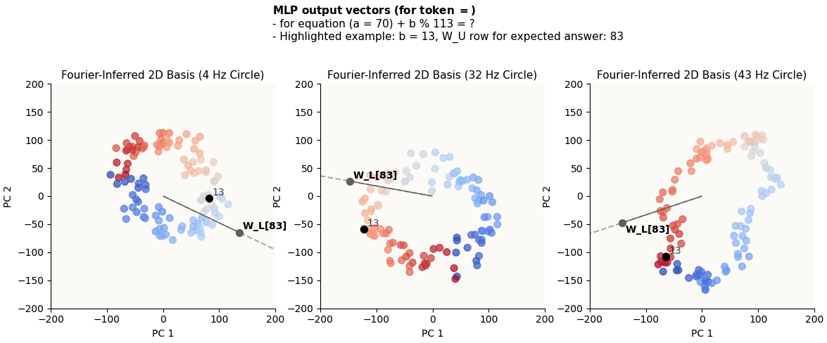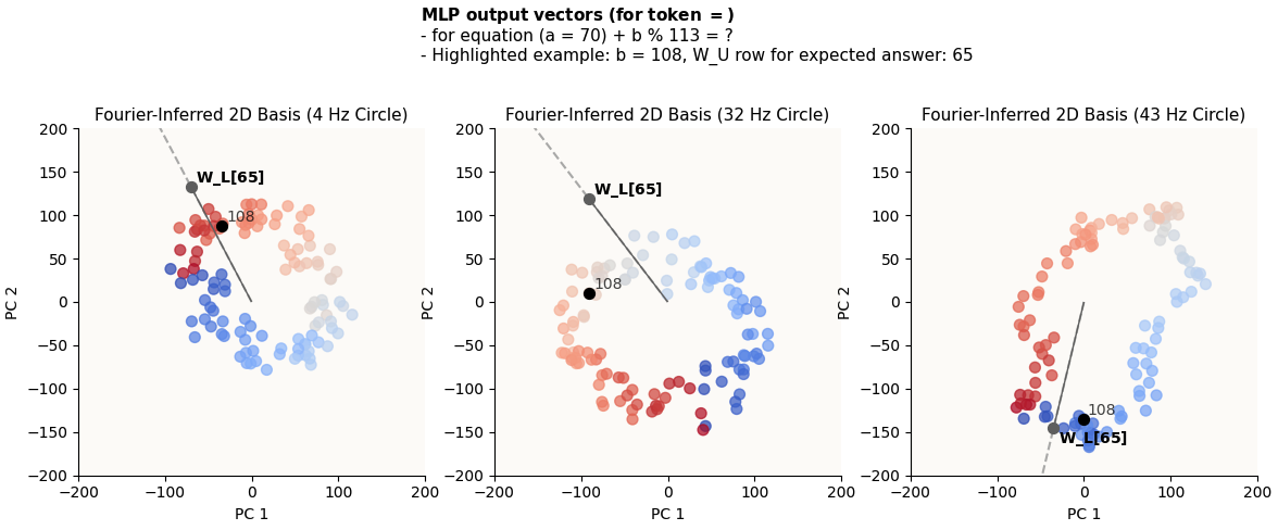 Remember that each colored dot represents a different value of b. You can see that for any chosen b value, that dot will be relatively highly in the direction of W_L[{expected_answer}] (call this “highly activating of the correct answer”). It doesn’t matter that it’s not the dot that’s the MOST in the direction of W_L[{expected_answer}], because it is unlikely that its competitors will also be highly activating of the correct answer in the other circles, because the circles are of unsynchronized frequencies, and ultimately the cumulative effects of alignment across all circles will still favor the correct answer.