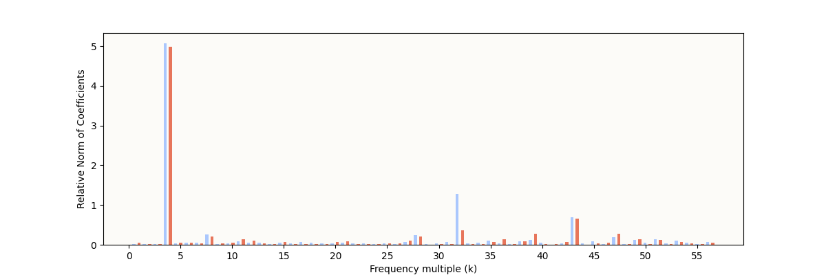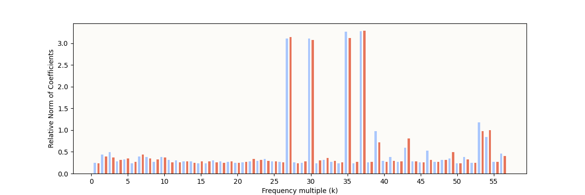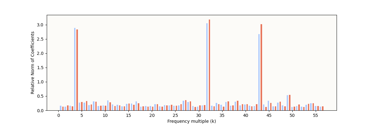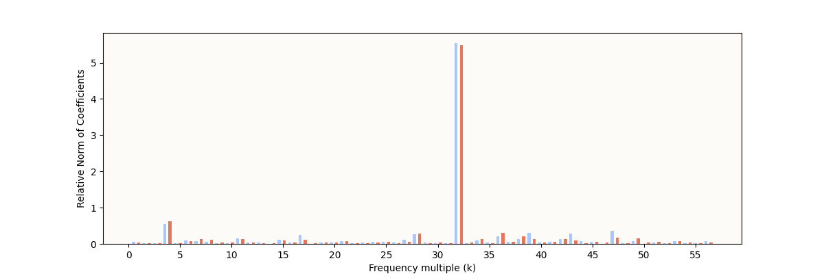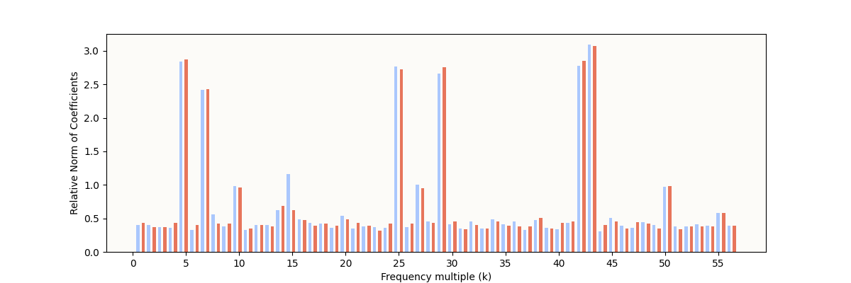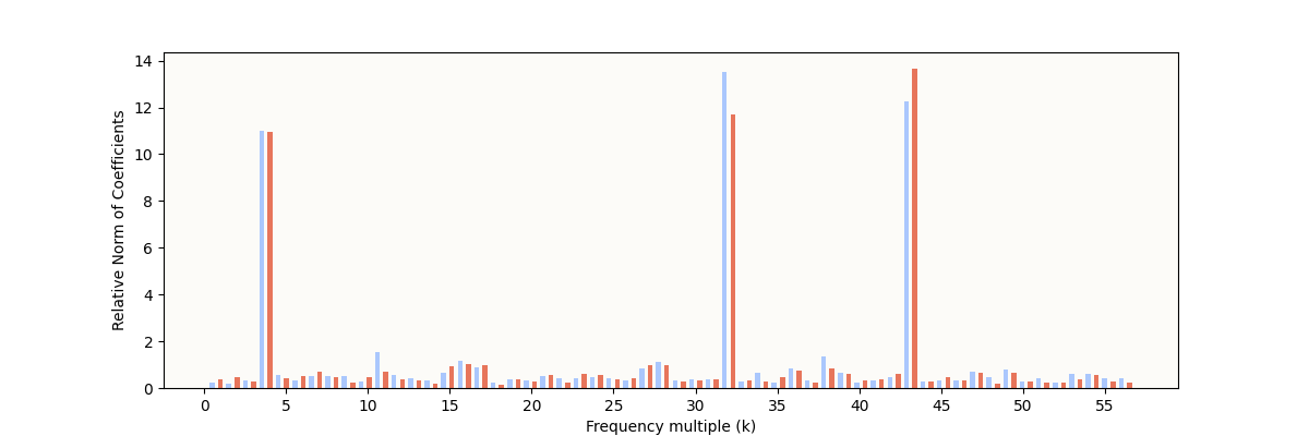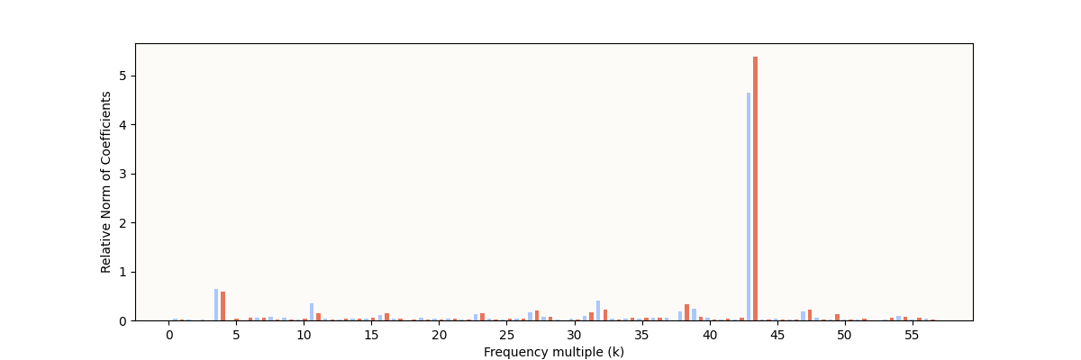 The expected characteristic is definitely present: some frequencies have very high relative norms, indicating some sparse periodic structure. However, it’s still noticeably different from the result reported in The Modulo Arithmetic Paper: