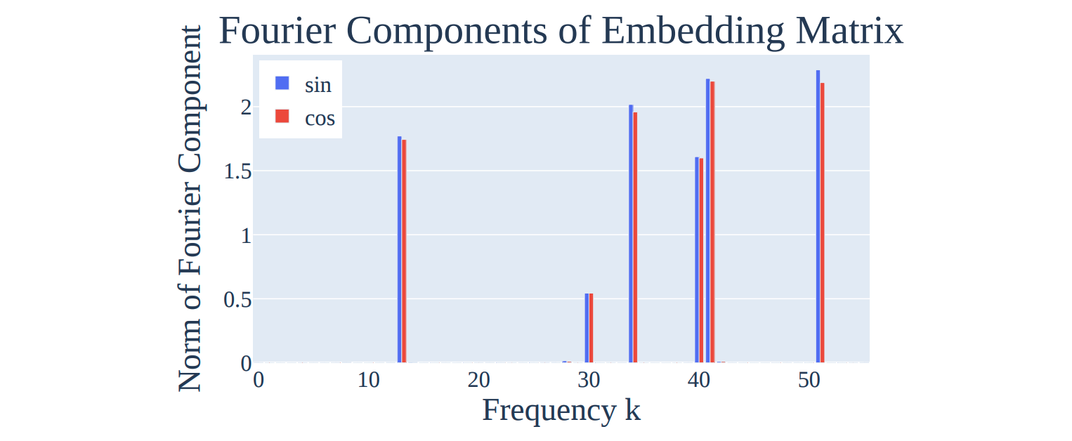 We can see here that with fewer epochs, I have even more “active” frequencies, that the model has ostensibly not “cleaned up.” As for point (3), that is not of any concern as the model doesn’t have to learn any specific set of frequencies, so long as those frequencies are useful (what is “useful” will be explained all the way at the end, and it will make a lot of sense).