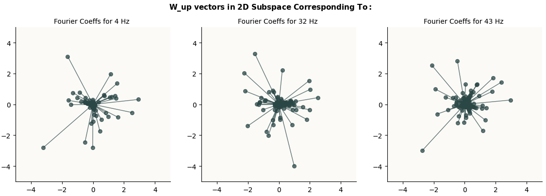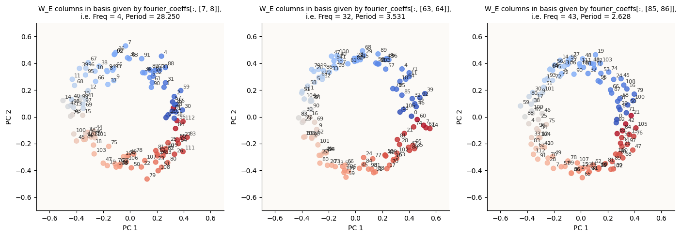 Now that we know that these 4 Hz, 32 Hz, and 43 Hz circles exist in the $o$ vectors, we can use another method to try and visualize them. It would simply be what we did at first with W_E and W_L: to run DFT on these $o$ vectors and to project them on the 2 directions given by the 128-dimensional $\sin$ and $\cos$ coefficients corresponding to each of these frequencies. I did them just to make sure that these circles were truly truly present in the $o$ vectors: