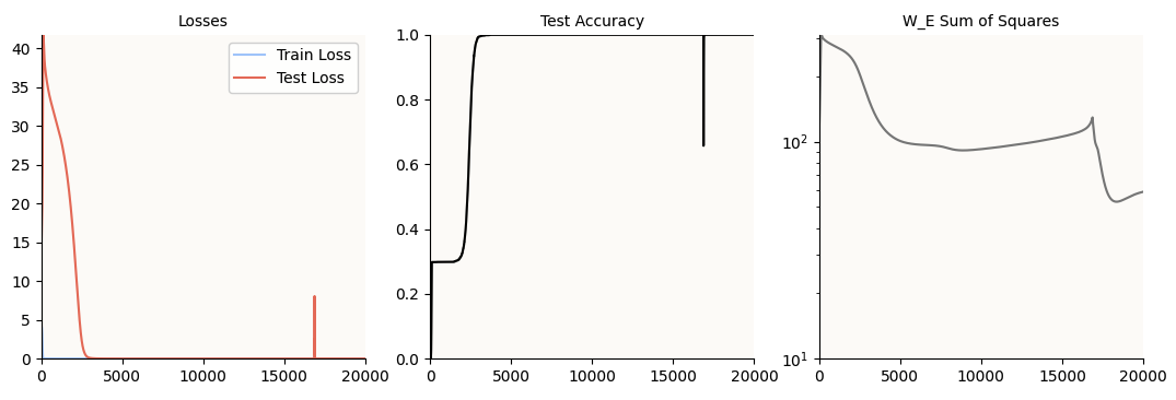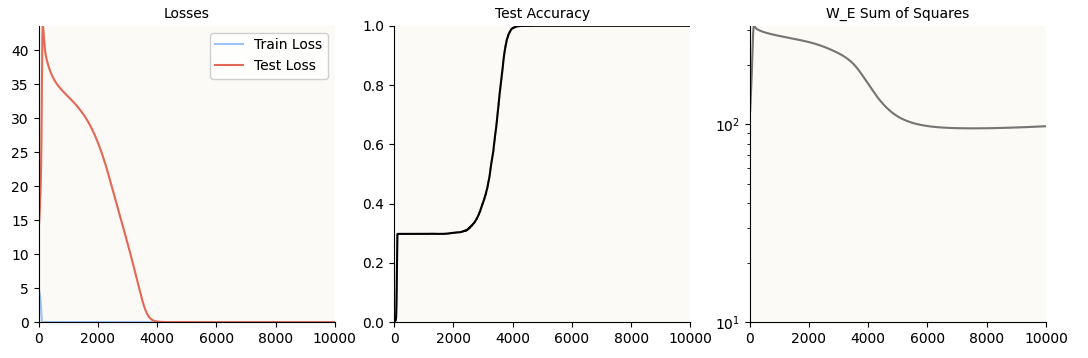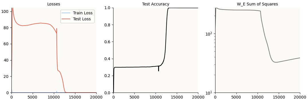 Notice that the test accuracy hits 100% at about 4,000 epochs, but just for good measure, I let the model train till 10,000 epochs. This is just in case the regularization (AdamW) is still hard at work shrinking irrelevant weights (or weights dedicated only to memorization and not generalization) to 0; as you can see, the sum of squares of the W_E weight matrix still continues to decrease till about 6,000 steps.