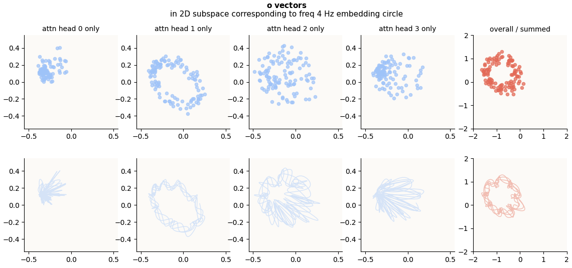 As you can see, the circles are not rotating. However, they seem to be sliding around the various quadrants / revolving around the origin. Now’s also a good time to remember how these circles were formed - the summation of petal structures (1 per head). The petals are themselves the trajectories traced out by various interpolations between 2 points on the embedding circle (or columns of $W_E$; animation in “Section 6.1”), which means these individual petal structures are strictly within the confines of the embedding circle. The summation of the petal structures (these circles above) should also hence be within the confines of the embedding circle, magnified by {num_heads} times at most. In this case, you see that the colorful circles are orbiting within the confines of the embedding circle (grey dots).