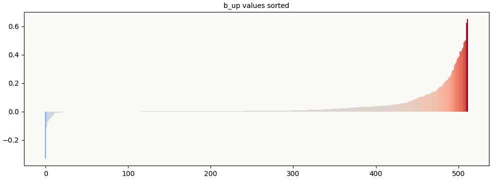 To prove that this is happening, we visualize the b_up values (sorted) and observe that insufficient (way fewer than 113) of them are significantly negative. The negative b_up values are what makes a useful superposition of features possible, and since there are way too few of them, we know that this model is not relying on superposition to encode features.
