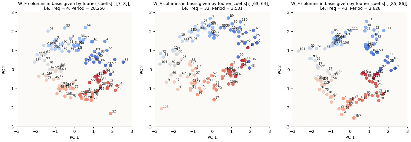 Then, to visualize the circular structure for k = 4, we would simply take fourier_coeffs[:, [1 + 2 * (k - 1), 2 + 2 * (k - 1)]] (i.e. the columns that correspond to the sin and cos d_model-dimensional coefficients for k = 4) as the 2 basis vectors. From now on, we’ll call this the Fourier-Inferred 2D Basis (k Hz Circle) or Fourier-Inferred 2D Subspace (k Hz Circle). Then, we would simply project the 113 W_E vectors onto these 2 basis vectors (normalized) and see what we get.