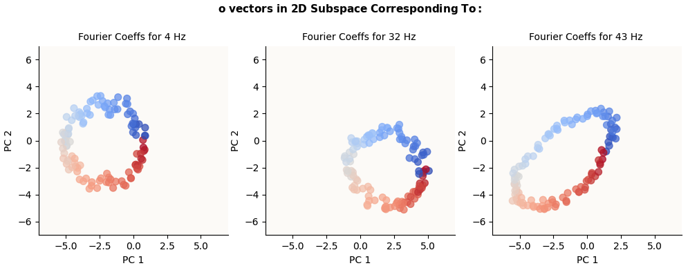o vectors in Fourier-Inferred 2D Basis (k Hz circle) for k in {4, 32, 43} (alternatively calculated)