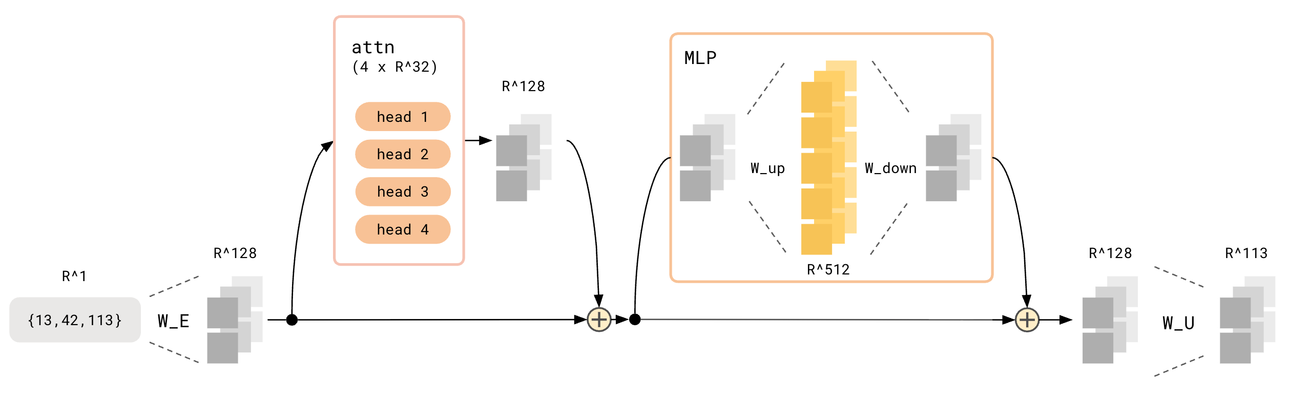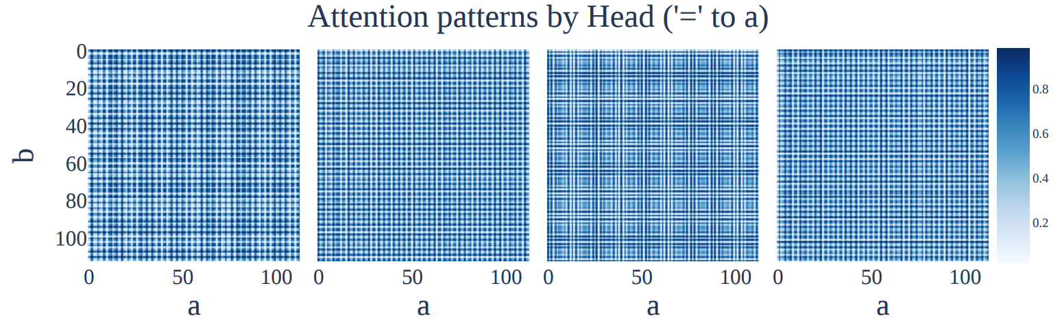 To restate the paper’s model task, a simple 1-layer Transformer is trained to finish the statement: {a} + {b} = where a and b are numbers $\in [1, P]$, where $P$ is some prime, in this case $113$, and the answer is the mathematical answer to $a + b \mod P$.
