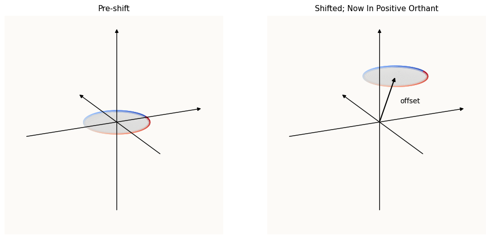 Following the argumentation that d_model = 128 is already sufficient dimensions to encode the 113 features without superposition, the job of the MLP layer isn’t to exploit $\text{ReLU}$ to arrange features in a superposition, but to actually shift the circles into the positive orthant such that they are NOT affected by $\text{ReLU}$. What this entails adding some offset (which can be done by b_up). Here’s some visual intuition: