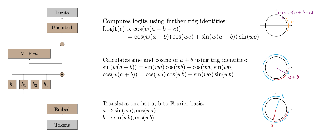 The first method is the “Clock” method, but because the description of the mechanics of the “Clock” in the Tegmark paper is unexplicit and imprecise to the point of being inadmissible to rigorous scrutiny, we will look at the preceding paper - Progress Measures For Grokking Via Mechanistic Interpretability - which introduces the original Clock algorithm alluded to by Nanda et. al in , henceforth referred to as just the Modulo Arithmetic Paper.